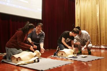 协和医院笪帮红教授带来了心肺复苏和与实践讲解,邀请了几名艺教中心的党员上台体验急救的紧张心理与实际操作的困难。