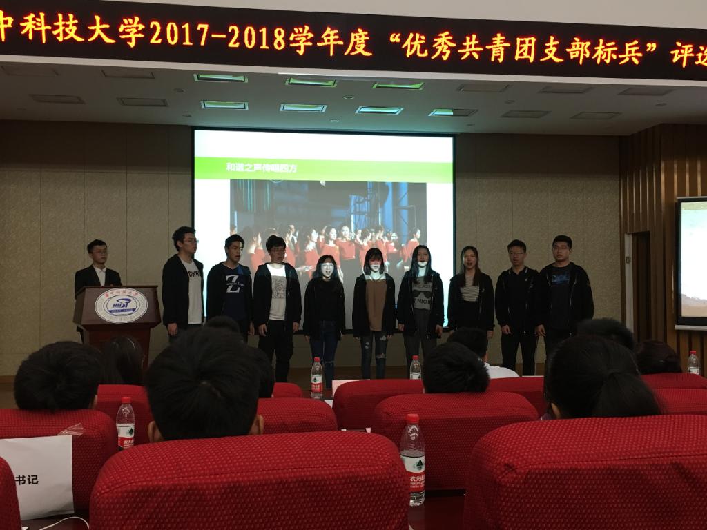 4月20日晚7点,华中科技大学2017-2018年度“优秀共青团支部标兵”评选答辩会在大学生活动中心305报告厅举行,艺术教育中心合唱团团支部荣获“优秀共青团支部标兵”称号。本次答辩分为支部展示,随机问...